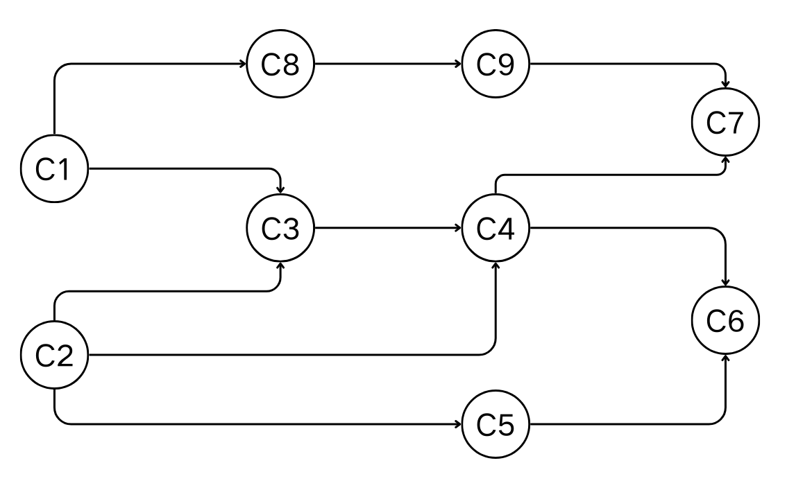 ve[0] = 0,按拓扑排序求出其余各顶点的最早发生时间ve[i]$(1 \leqslant i \leqslant n-1)$。如果得到的拓扑有序序列中顶点个数小于网中的顶点数 $n$,则说明网中存在环,不能求关键路径; - 从汇点 $v_n$ 出发,令