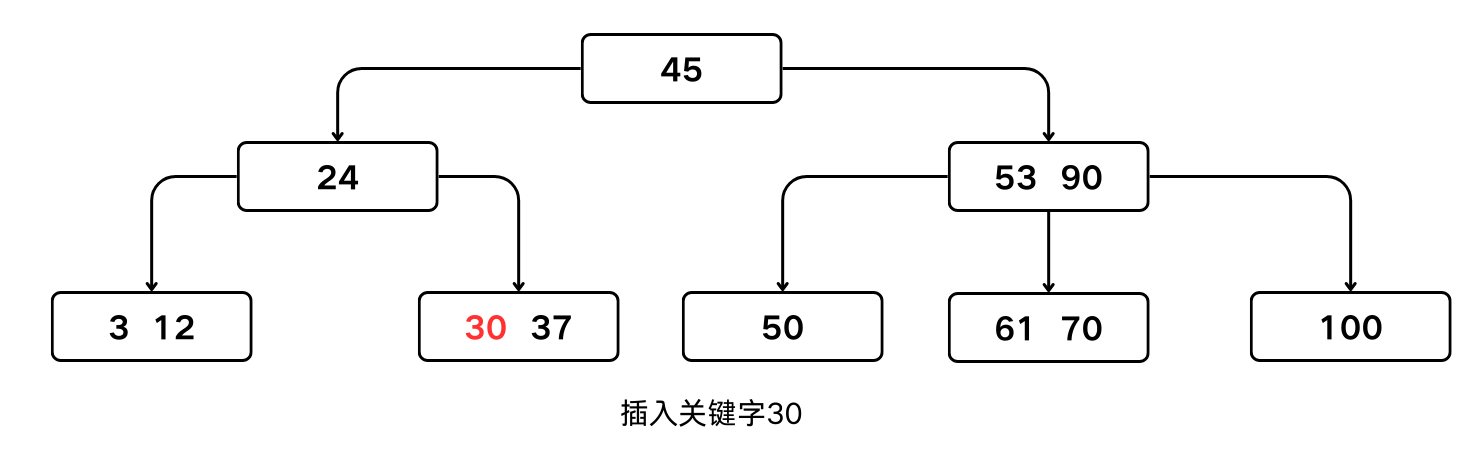 - 每次插入一个关键字不是在树中添加一个叶子结点,而是在查找的过程中找到叶子结点所在层的上一层;