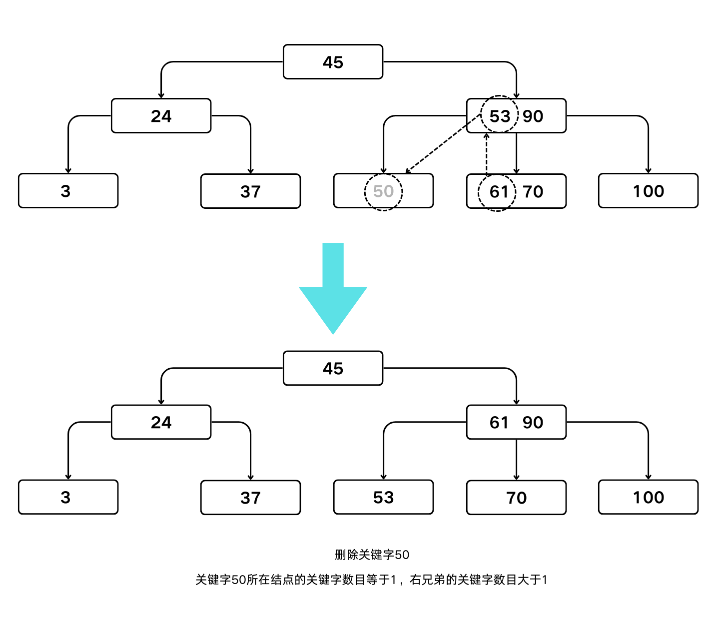 - 若被删关键字所在结点的关键字数目等于 $\lceil m/2 \rceil -1$,而与该结点相邻的右兄弟(左兄弟)结点中的关键字数目大于 $\lceil m/2 \rceil-1$,则需将其兄弟结点中的最小(最大)的关键字上移到双亲结点中,而将双亲结点中小于(大于)且紧靠该上移关键字的关键字下移到被删关键字所在的结点中。