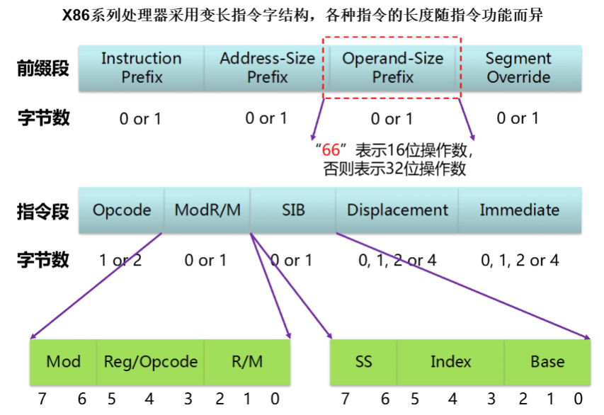X86系列处理器采用变长指令字结构,各种指令长度随指令功能而异。